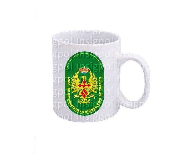 Taza con emblema de la asociación de retirados de la guardia civil de tráfico a cada lado del asa.